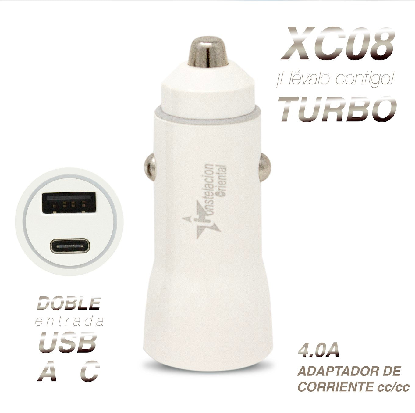Adaptador de corriente ca/cc para automóvil con 2 puertos de salida USB, uno de tipo A y el otro puerto de tipo C.
